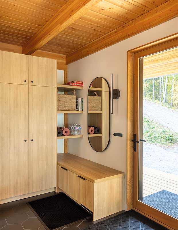 Cathy et Nadia ont réfléchi ensemble pour optimiser la fonctionnalité des lieux. « Nous avions besoin de rangements, explique Nadia, nous avons donc aménagé un mur entier de rangements intégrés à l’entrée. On ne veut pas qu’un placard occupe un espace précieux quand on rentre avec des skis ou des vêtements de neige mouillés. »