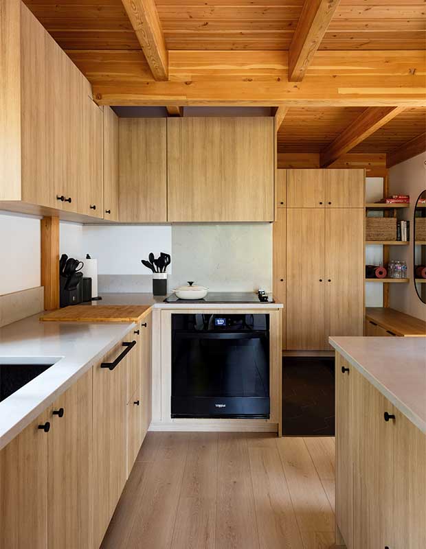 Au final, la cabane donne l’impression d’être plus grande qu’elle ne l’est en réalité. La cuisine spacieuse est idéale pour cuisiner, tandis que le salon et les chambres à coucher sont ouverts et épurés. Chaque meuble a été sélectionné en fonction de l’agencement et de la fluidité de l’espace.