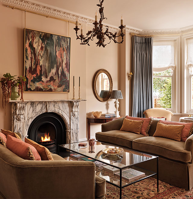 Le salon est un espace de réception plus formel. La designer et propriétaire Elizabeth Macfarlane a commandé un nouvel encadrement de cheminée de style victorien classique en marbre Arabescato. « J’ai acheté beaucoup de luminaires aux enchères ; on peut y trouver les plus beaux de style vintage », explique-t-elle. « Dans le salon, il y a un lustre qui se trouvait autrefois dans un hippodrome à Cannes, ce qui est amusant car mon mari travaille dans le cinéma et se rend chaque année à Cannes. »