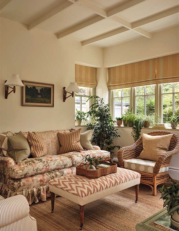 Rayures, motifs floraux, pois et zigzags s’entrechoquent joyeusement dans la véranda. Elizabeth préfère les espaces séparés aux plans ouverts : « J’aime avoir différentes pièces », dit-elle. « Cela permet de créer de nombreux intérieurs avec des personnalités différentes. »