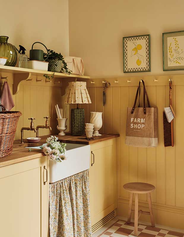 La charmante buanderie est dotée de lambris jaune crème et d’un joli carrelage aux teintes terracotta et rose. « Même la buanderie, habituellement banale, semble spéciale. Je voulais apporter de la gaieté aux tâches ménagères », explique Elizabeth.