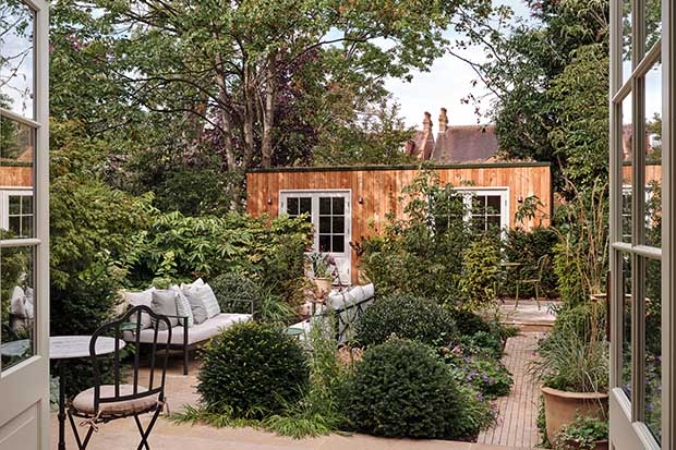 La salle à manger est la seule addition structurelle à la maison ; ils voulaient qu’elle ressemble à une véranda édouardienne. De grandes portes-fenêtres donnent sur le jardin.