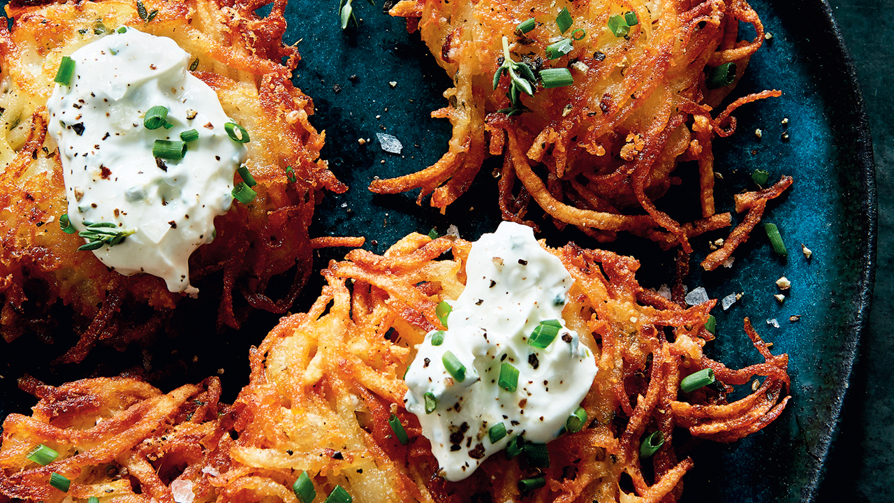 Hanukkah ne serait pas Hanukkah sans latkes et crème fraîche. Alors que de la fête juive des lumières bat son plein jusqu’au 22 décembre, nous vous proposons une délicieuses recettes de latkes aux pommes de terre créée par Alexandre Cohen et Raegan Steinberg, le couple à l’origine du célèbre Arthurs Nosh Bar , dans le quartier Saint-Henri, à Montréal.